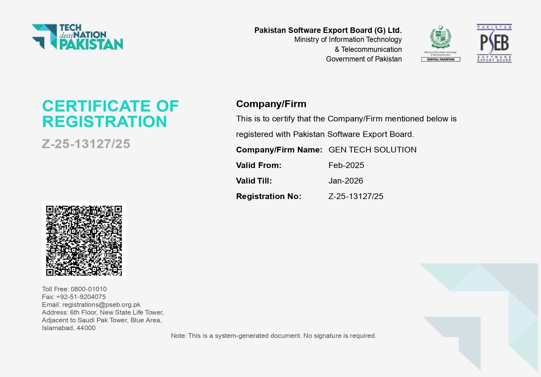 Gen Tech Solution Private Limited, registered under the Companies Act, 2017 (XIX of 2017) with Incorporation No. 0274671.